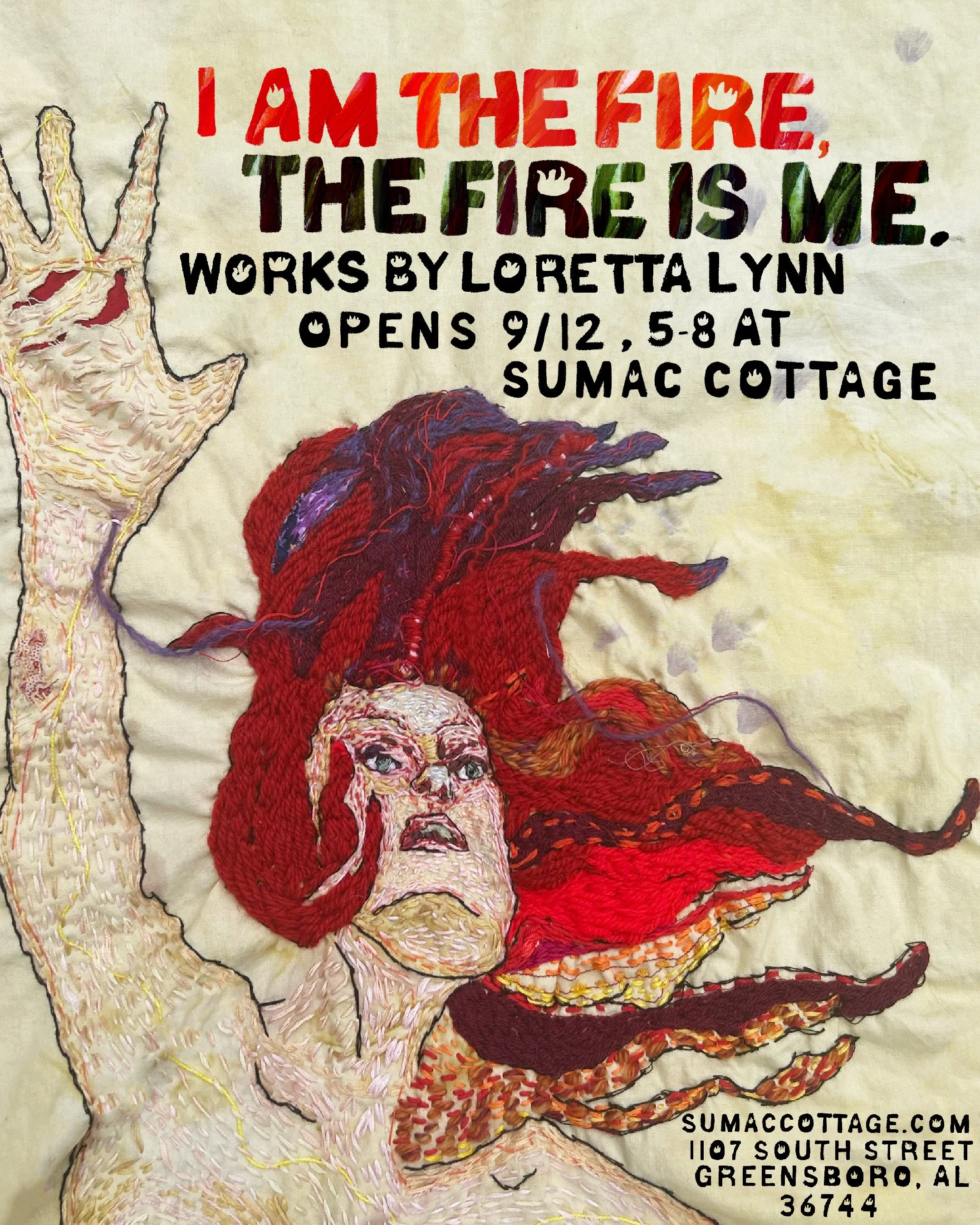 Sumac Cottage is thrilled to present I Am the Fire, The Fire Is Me, a show of new textile works byTuscaloosa-based fiber artist Loretta Lynn. Join us for the opening reception on Friday, 9/12 from 5-8 pm. The show will be on display through 10/18 on Fridays and Saturdays from 10-2 and by appointment.