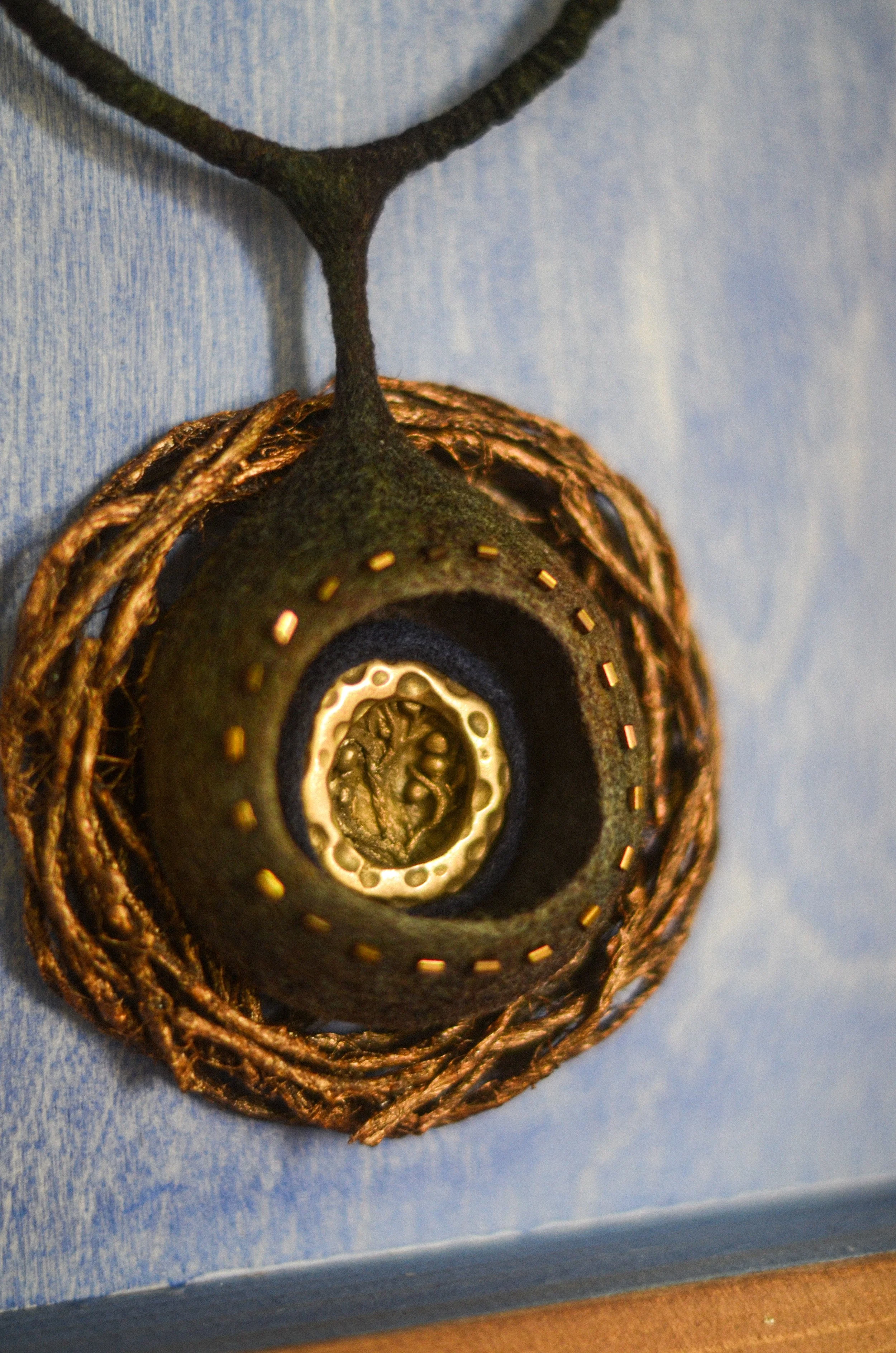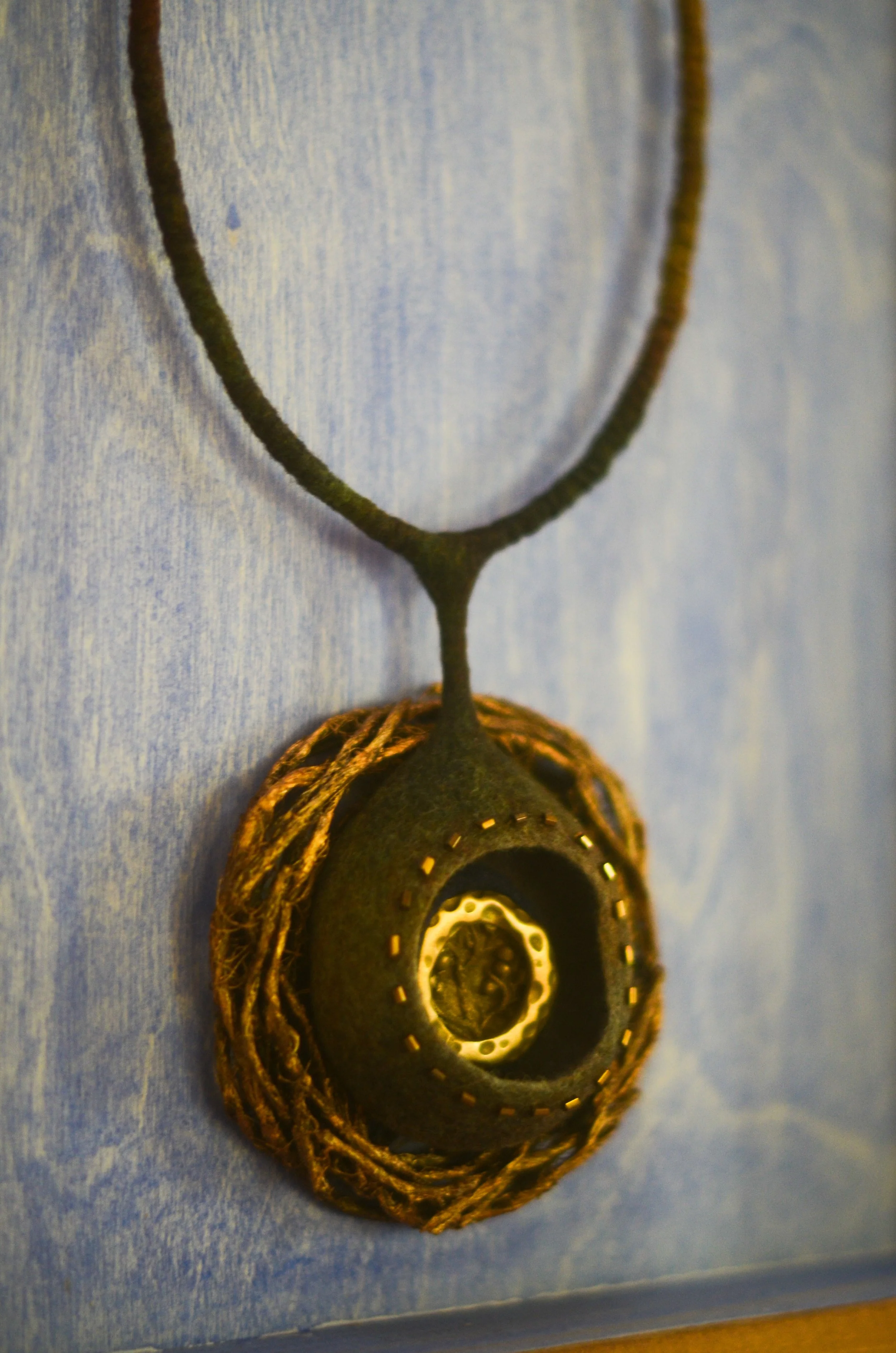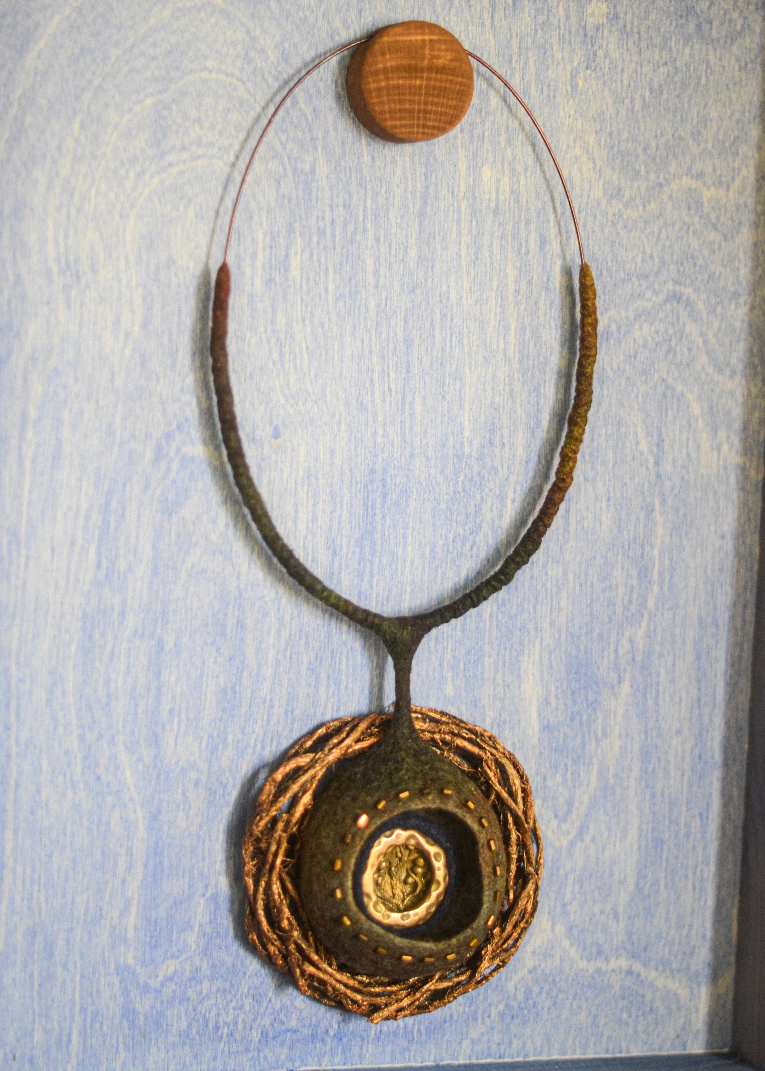 Using wool fiber, twine, and other materials found in my studio, this piece was created to embody the elements of a bird’s nest, embracing strength, beauty, and the intricacy of materials woven together to create a space that is both safe and protective. It is the result of researching techniques to create encapsulations within layers through wet felting over multiple resists, and further explores the use of natural fibers in combination with non-organic materials to create form. The piece itself provides both visual and functional purpose, as it can be both wall art or worn as embellishment around one’s neck.